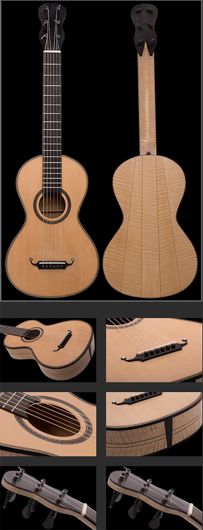 As I do with all of my romantic guitars, I laminate 1mm Sitka spruce to in this case curly maple to make up both the back and sides of these instruments. Necks are two-piece bookmatched curly maple. I have developed my own v-joint that I machine out on CNC machine and then hand fit and finish to join the headstock and neck together I’ve built this guitar with both Sitka an Italian spruce tops. Both are very pleasant to the ear, with the Sitka producing a more nasal sounding instrument, which makes it an appropriate choice for early music, whereas the Italian spruce is generally makes for a sweeter sounding instrument. I certainly will entertain building this guitar using other species of spruce as well as cedar. The rosette, purflings, are combinations of white and black dyed maple. Binding and headstock, front and black plates, and bridge are Macassar or Gabon ebony, as is the fingerboard.