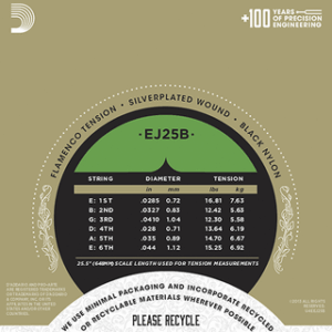 D’Addario EJ25B normal tension Flamenco bass strings are constructed using a multifilament stranded core material that dramatically improves the life and tuning consistency of the wound basses when compared to traditional nylon cores. Complimented by black nylon trebles, this set was created and tested with artists worldwide to deliver a flexible feel while still maintaining a quick attack response that is essential for flamenco players.