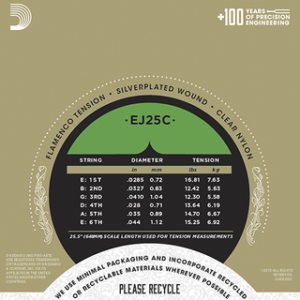 D’Addario EJ25C normal tension Flamenco bass strings are constructed using a multifilament stranded core material that dramatically improves the life and tuning consistency of the wound basses when compared to traditional nylon cores. Complimented by clear nylon trebles, this set was created and tested with artists worldwide to deliver a flexible feel while still maintaining a quick attack response that is essential for flamenco players.