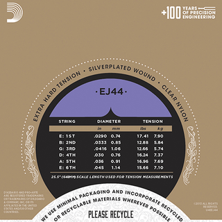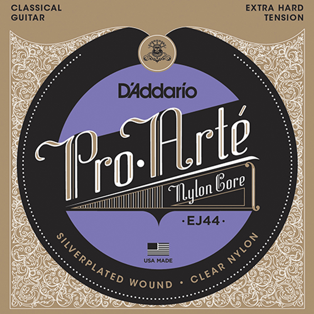 The extra hard tension D’Addario EJ44 is optimal for maximum string resistance and projection without compromising tone. The EJ44 Pro-Arté treble strings are sorted by a sophisticated computer-controlled laser machine which performs diameter and tension measurements, ensuring true-sounding, precise trebles in every set. EJ44 basses are wound using silverplated copper on a multi-filament nylon core for consistent and warm, yet projecting tone.