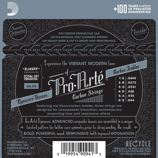 D’Addario EJ45FF, normal tension, features Pro-Arté Carbon trebles and Dynacore basses for unsurpassed superior intonation with the perfect blend of tone, brightness, and projection. Experience the vibrant, projecting and contemporary tone of D’Addario’s Pro-Arté Carbon strings. Designed to the exacting specifications of Pro-Arté nylon trebles, fluorocarbon strings deliver unmatched superior intonation, a responsive attack and modern projecting tone. Paired with the bold and powerful Dynacore basses, Pro-Arté Carbons offer the ideal combination of tension and tone for today’s classical player.