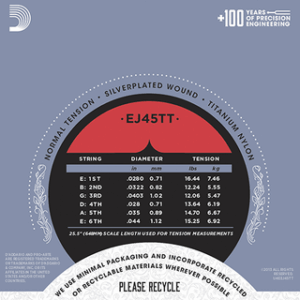 The normal tension D’Addario EJ45TT classical guitar strings are the best selling Pro-Arté Dynacore set, preferred for its balance of rich, projecting tone and comfortable feel. D’Addario Pro-Arté Dynacore sets are constructed using exclusive multifilament stranded core material with a revolutionary winding technique. The result is a truly unique and contemporary tone… rich, round and full with dramatically improved string life, tuning stability and consistency. The Dynacore EJ45TT set is complemented by bright and projecting titanium trebles for optimal tonal balance. Additionally, each treble string is laser sorted for unsurpassed intonation consistency.