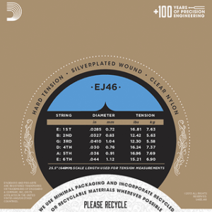 The hard tension D’Addario EJ46 classical guitar strings are a popular choice for their rich tone, increased resistance and strong projection. The EJ46 Pro-Arté treble strings are sorted by a sophisticated computer-controlled laser machine which performs diameter and tension measurements, ensuring true-sounding, precise trebles in every set. EJ46 basses are wound using silverplated copper on a multi-filament nylon core for consistent and warm, yet projecting tone.