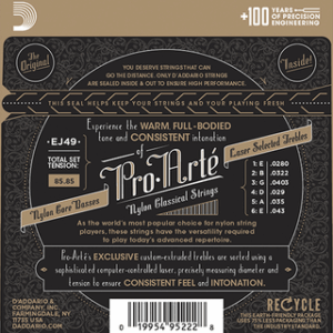 The normal tension D’Addario EJ49 classical guitar strings contain black nylon trebles, preferred for their balance of rich tone, comfortable feel and dynamic projection. Like in all Pro-Arte sets, the EJ49 treble strings are sorted by a sophisticated computer-controlled laser machine which performs diameter and tension measurements, ensuring true-sounding, precise trebles in every set. The EJ49 basses are wound using silverplated copper on a multi-filament nylon core for consistent and warm, yet projecting tone.