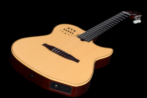 The Multiac Duet Ambiance nylon string also features a 25 ½” scale and slimmer nut width than the classically inspired Grand Concert Duet Ambiance, making it easy for electric steel string players to transition to nylon strings. This model features a chambered mahogany body with a solid spruce top, as well as a dual source preamp with feedback control and an undersaddle transducer.