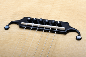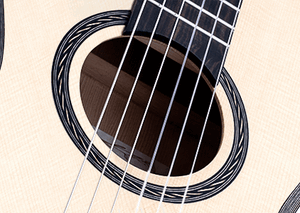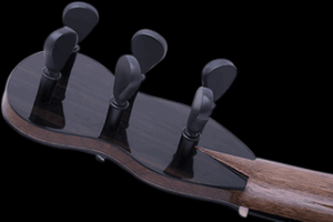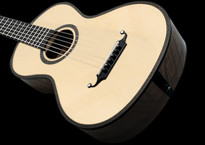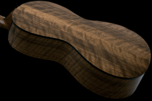 My Lacote style guitars are interpretations of Rene Lacote’s traditional paddle-type or figure-8 headstock creations with the fingerboard resting on the top of the instrument as opposed flush with body. Unlike the originals, both the back and sides are lined with top grade sitka spruce as opposed to just the back. I hand select fine Australian curly wlanut veneers for the back and sides. The bookmatched back and matching side sets are striking. I have a limited number of sets of this wood. Other than the Planetary Pegs and neck mounting hardware the guitar is entirely crafted by me using both hand tools and CNC technology in my Morganton, NC shop.