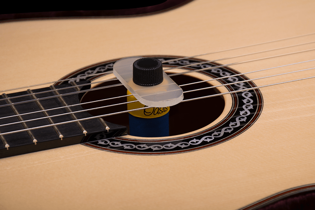 When mounted between the D and G strings in your guitar’s soundhole, the USA-made Blue Oasis OH1 Guitar Humidifier protects your instrument against hairline cracks that might result from drying out. What sets the OH1 apart from many other soundhole-mounted humidifiers is its elegant anti-leakage design. Soundhole humidifiers that use foam or sponge to hold water may provide adequate defense against dry environments, but fail to protect the instruments from potential leakage from the humidifiers themselves. The Oasis OH1 prevents water leaking into your guitar in two ways: